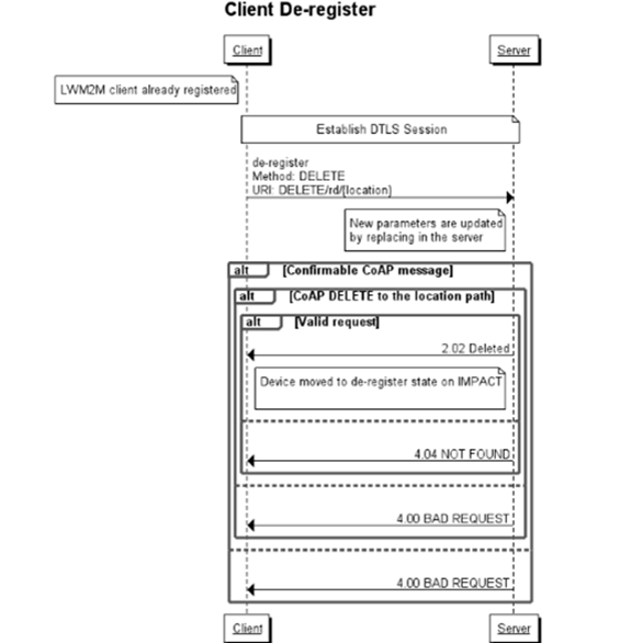 If LWM2M client no longer wants to be available to the LWM2M server then LWM2M client sends a “De-Register” command to the LWM2M server. When client sends a De-Register command, the IMPACT server retains the information so that client can re-initiate the registration process. The client status on the server is changed to De-Register.